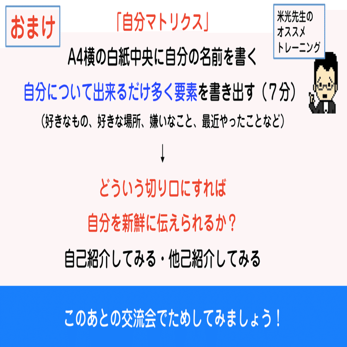さらに他の人の「自分マトリクス」を見ることで、他人が興味のある話題がひと目でわかって雑談が広がりやすいうえに、自分が知らない話題なら知識の幅も広げられるという一石三鳥なワークです。