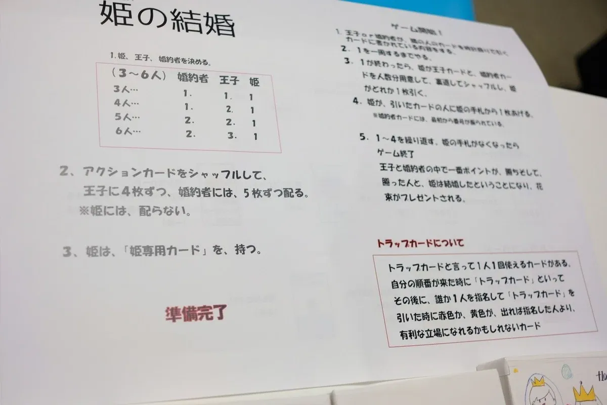 いろんな特殊カードを使いつつ、姫役のプレイヤーから王子候補がより多くのポイントを獲得するゲームで、王子にも婚約者などランクがあるのが面白い。